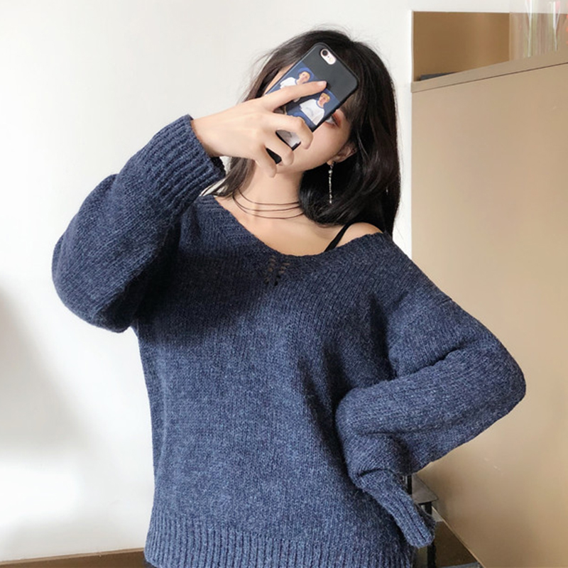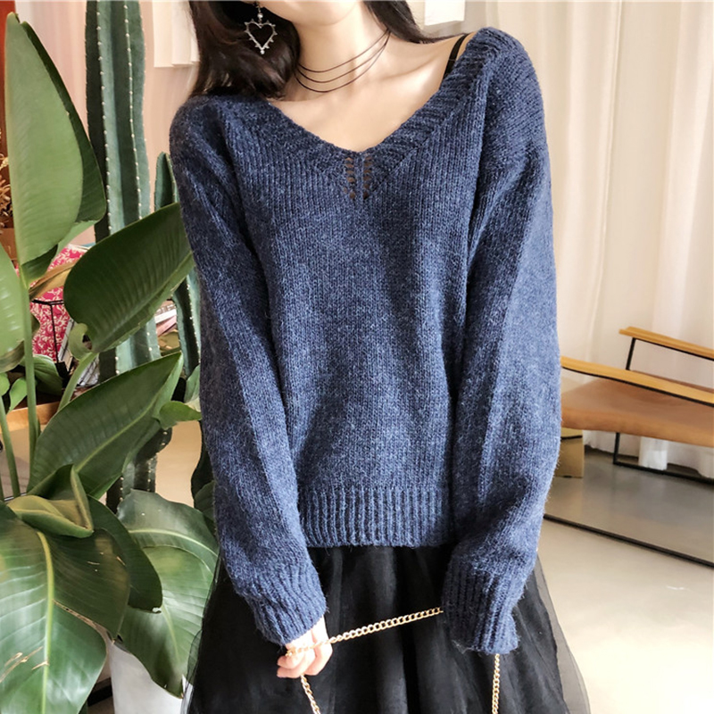 女裝2018秋裝新款復古寬松V領慵懶風毛衣學生長袖針織上衣打底衫