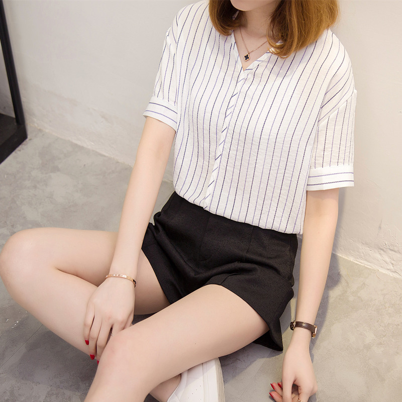 / 條紋襯衫女夏短袖上衣寬松時尚韓版打底衫V領春裝女裝新款潮