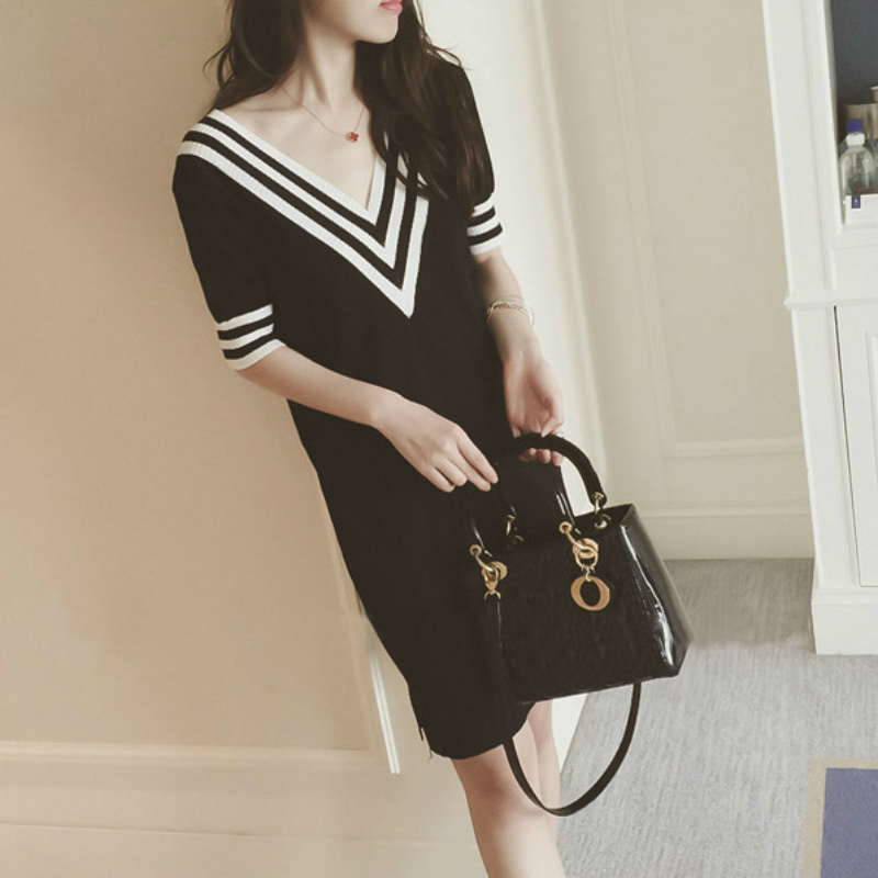春秋裝新款韓版中長款拼接條紋V領長袖打底衫針織衫連衣裙女
