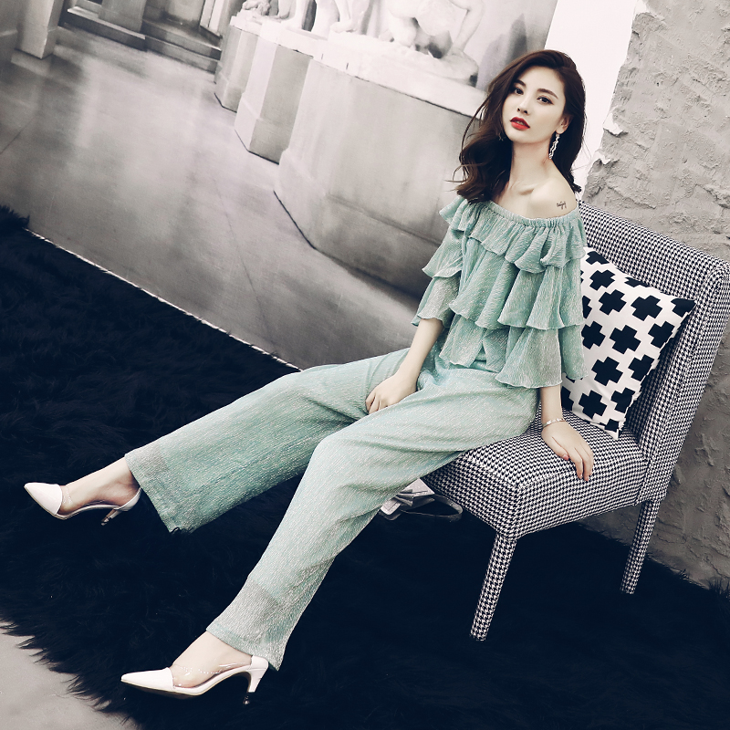 / 歐洲站2018新款夏裝歐貨潮休閑一字肩短袖亮絲T恤闊腿褲兩件套裝