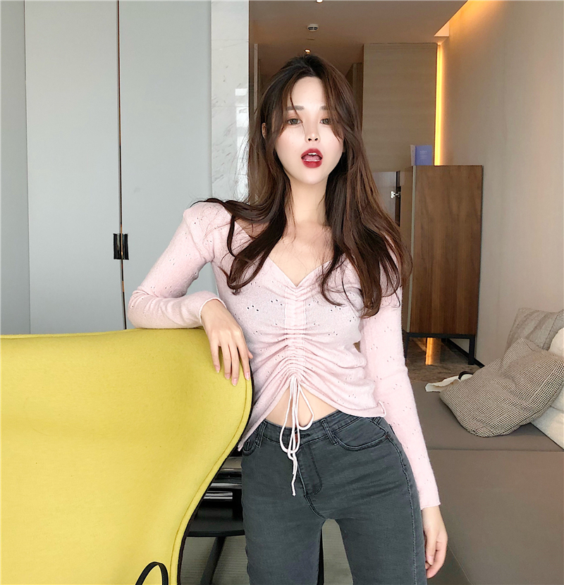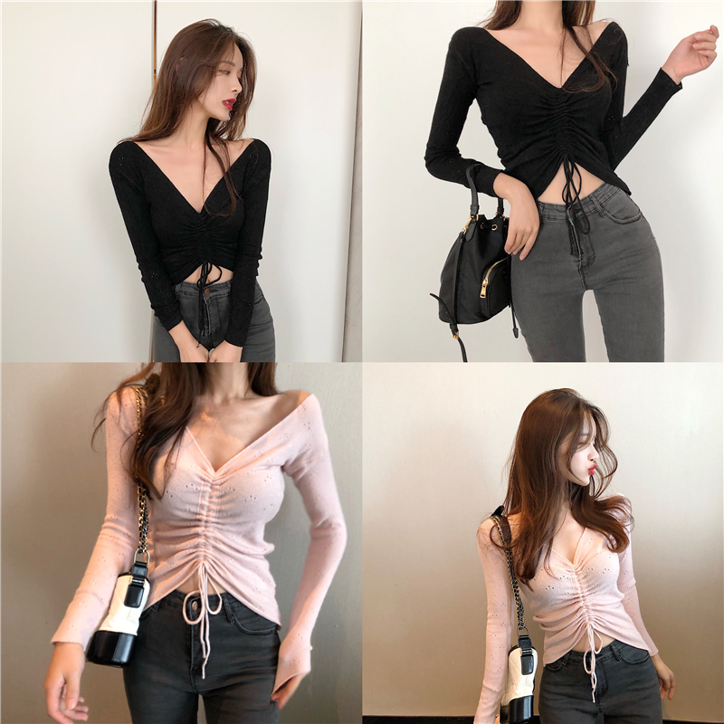 / 港味復古chic修身抽繩系帶V領百搭上衣秋季新韓版長袖顯瘦針織衫