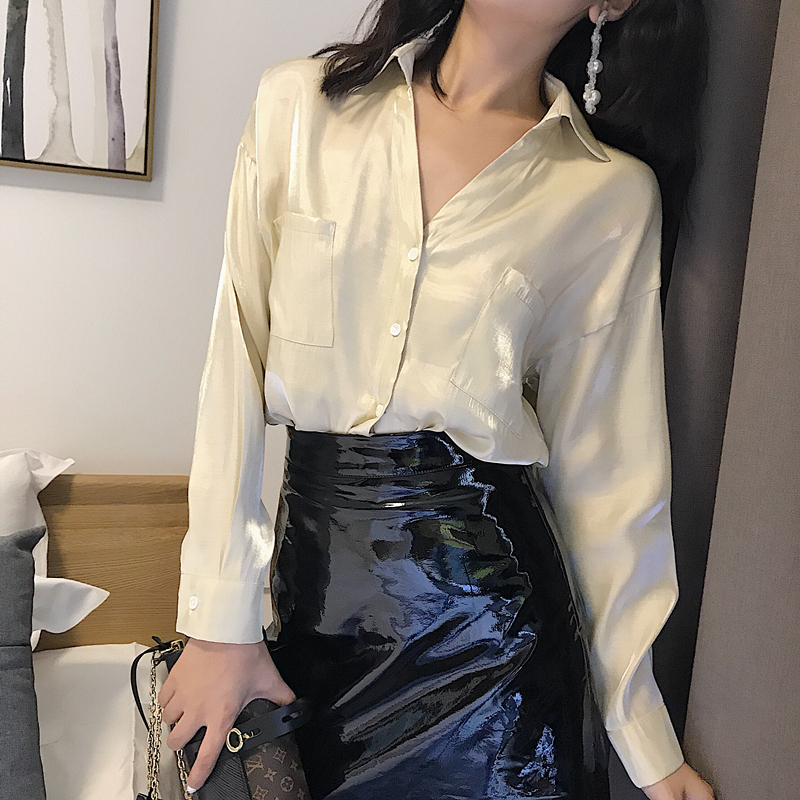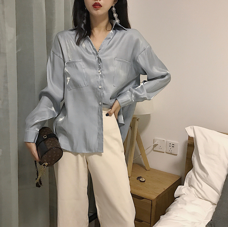 / 韓版時尚新款百搭chic早秋上衣慵懶寬松顯瘦性感v領珠光長袖襯衫
