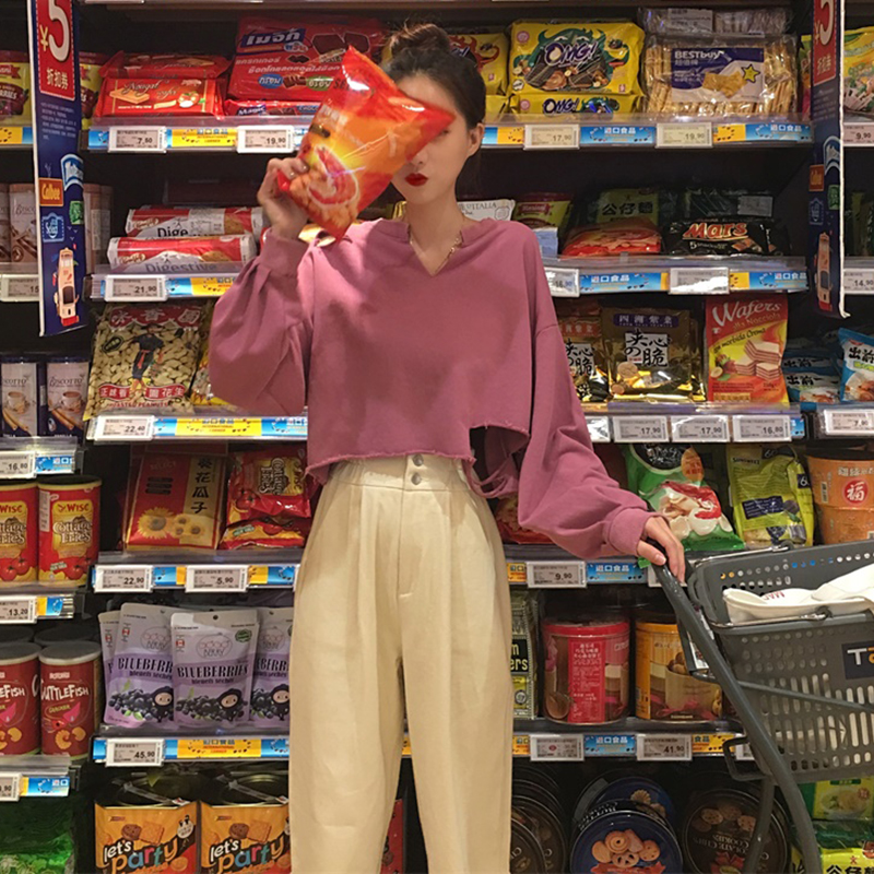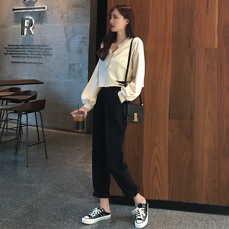 / 休閑套裝女秋季新款韓版寬松V領破洞短款長袖衛衣高腰哈倫長褲子