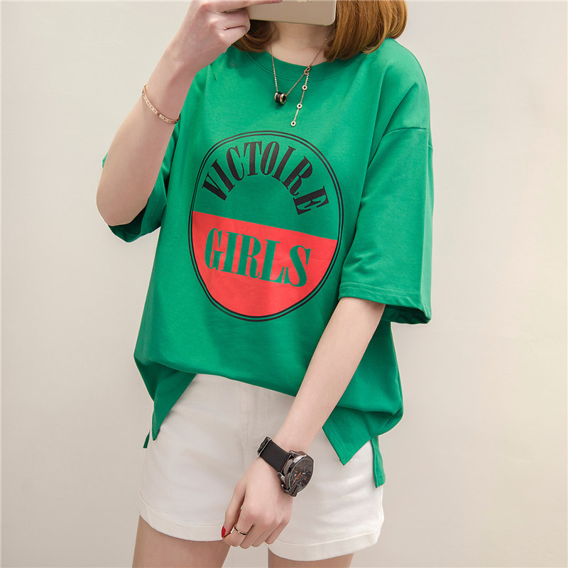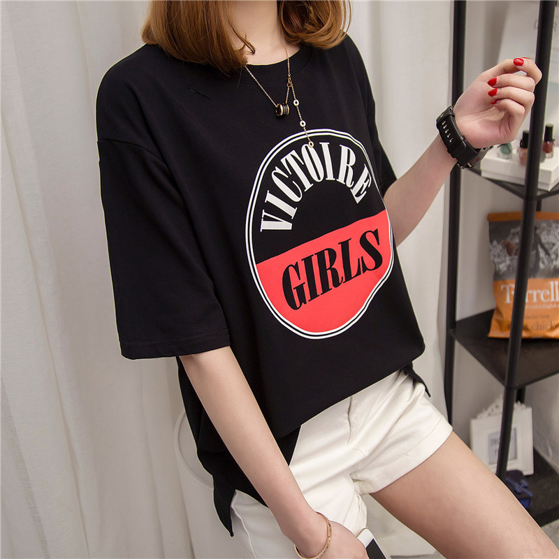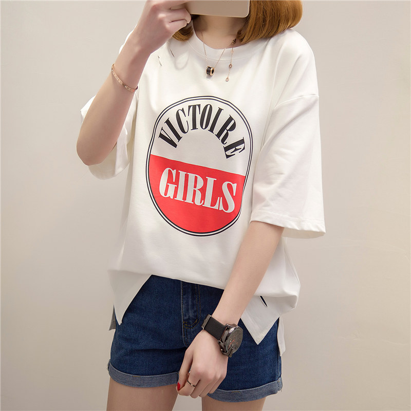 女裝春裝新款潮短袖t恤女寬松中袖韓版學生開叉夏季體恤百搭