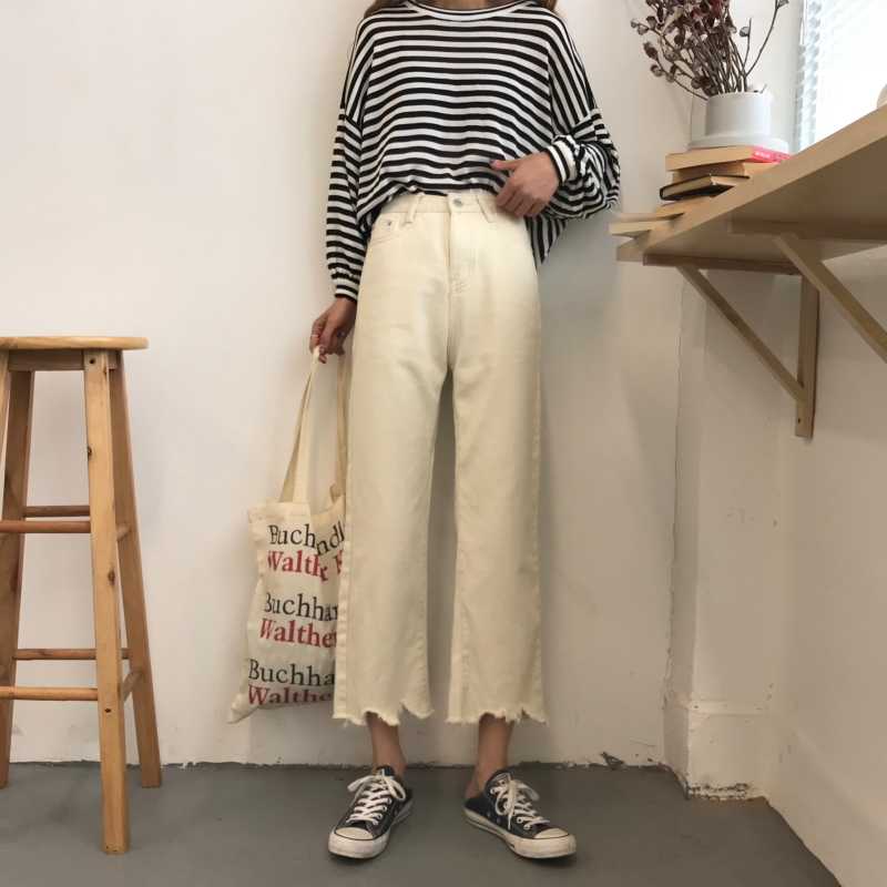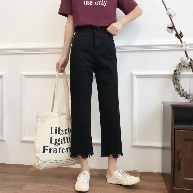 / 秋季韓版chic寬松復古不規則撕邊牛仔褲高腰直筒褲闊腿褲九分褲女