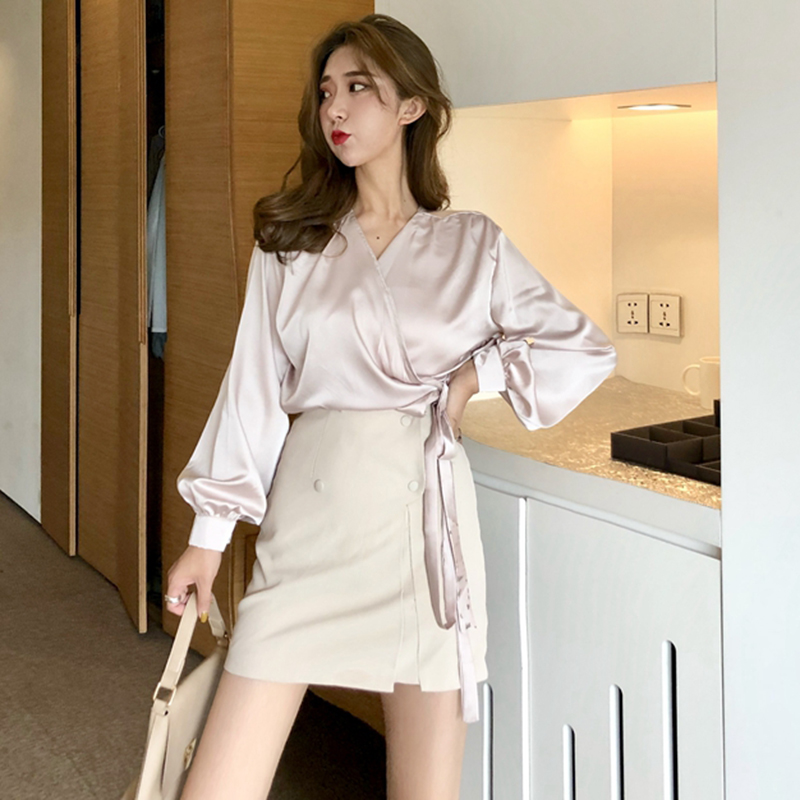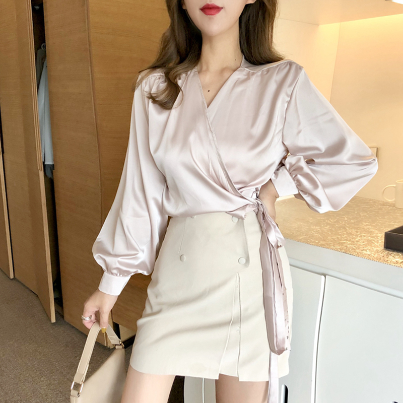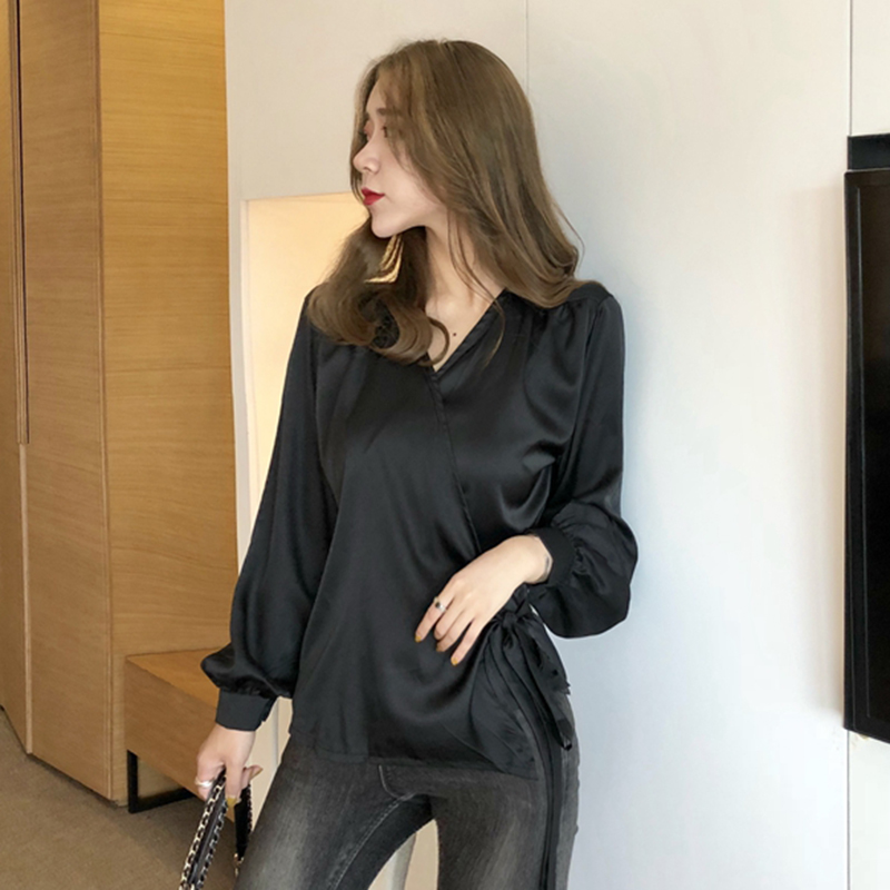 / 冷系女裝襯衫女港味復古V領系帶收腰長袖襯衣秋裝新款設計感上衣