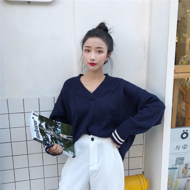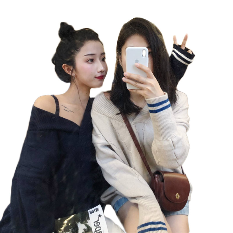 / 多穿法露肩V領套頭慵懶風毛衣女裝秋季新款時尚百搭韓版長袖上衣