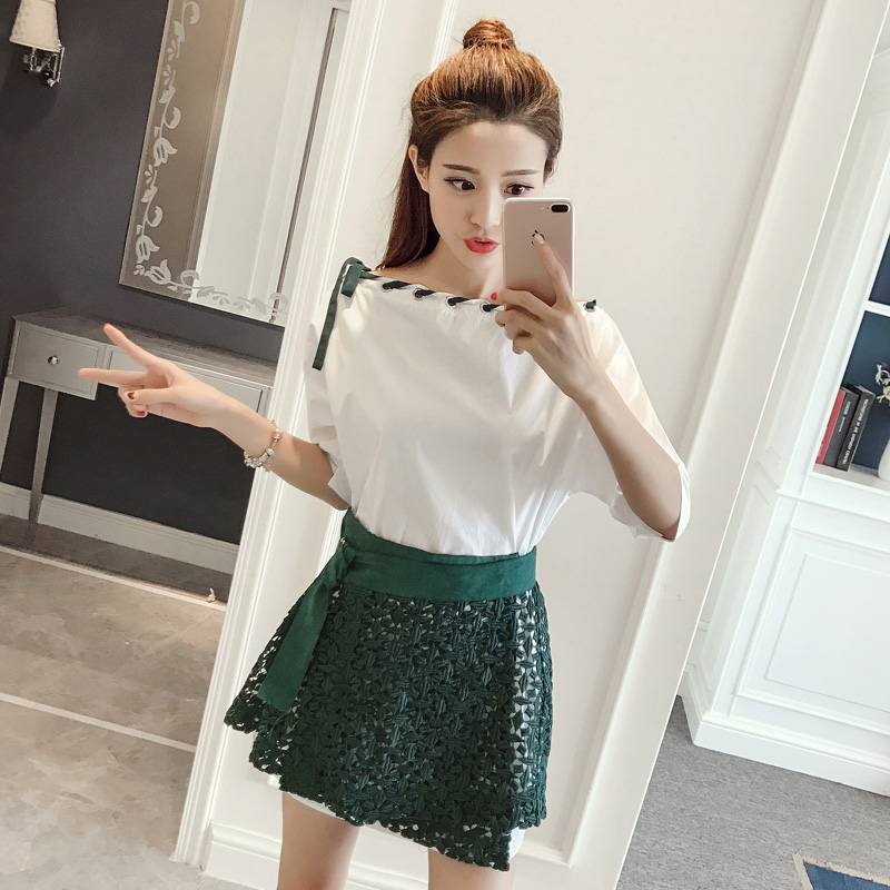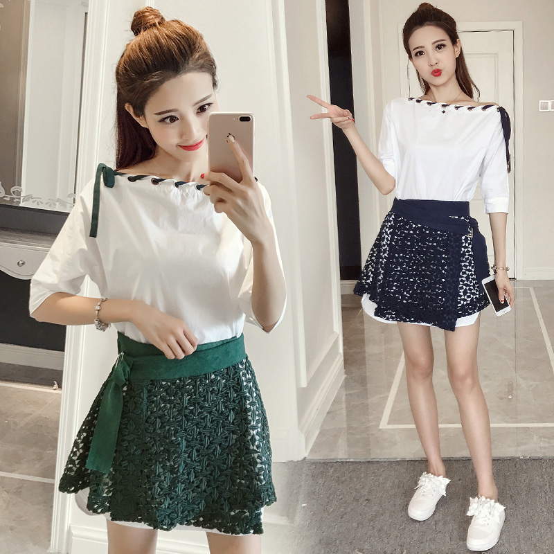 / 夏季新款女裝韓版中袖上衣兩件套寬松顯瘦休閑半身短裙套裝潮
