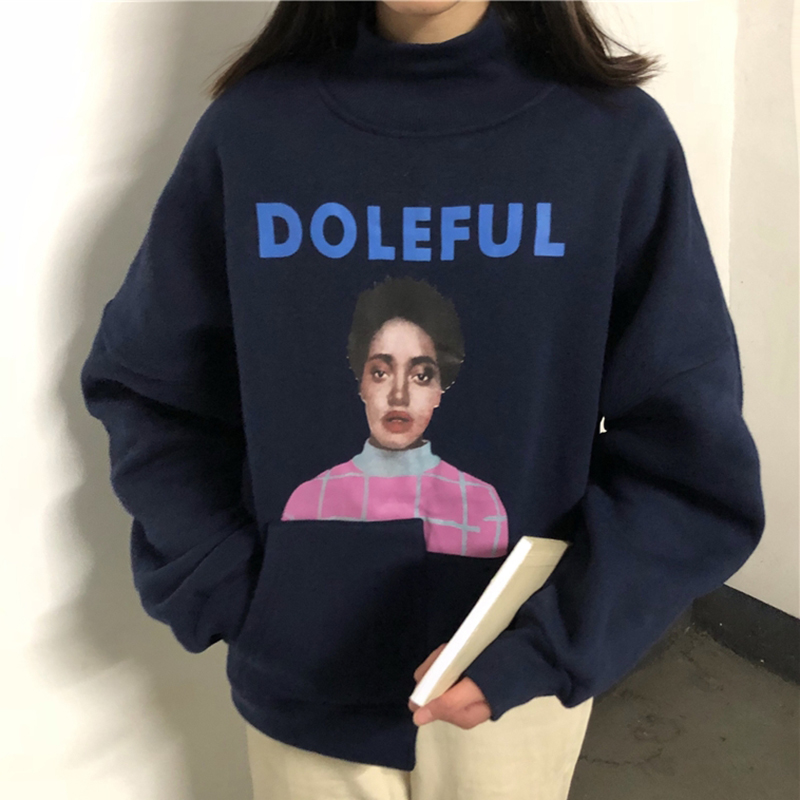 秋冬女裝新款字母印花半高領加絨衛衣學生不規則寬松長袖外套上衣