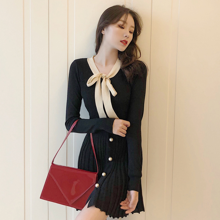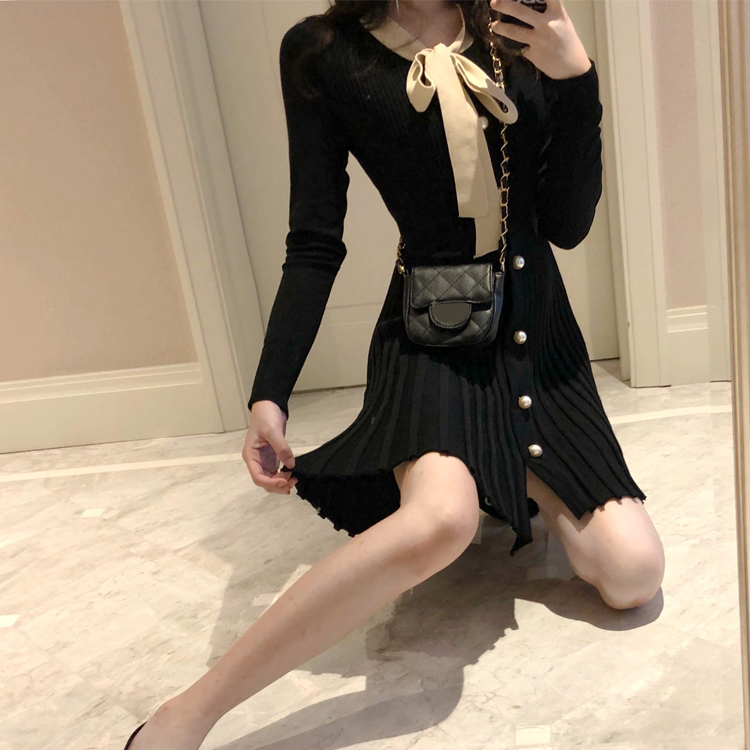 chic早秋裙子網紅同款氣質時尚短裙蝴蝶結領口收腰顯瘦長袖連衣裙