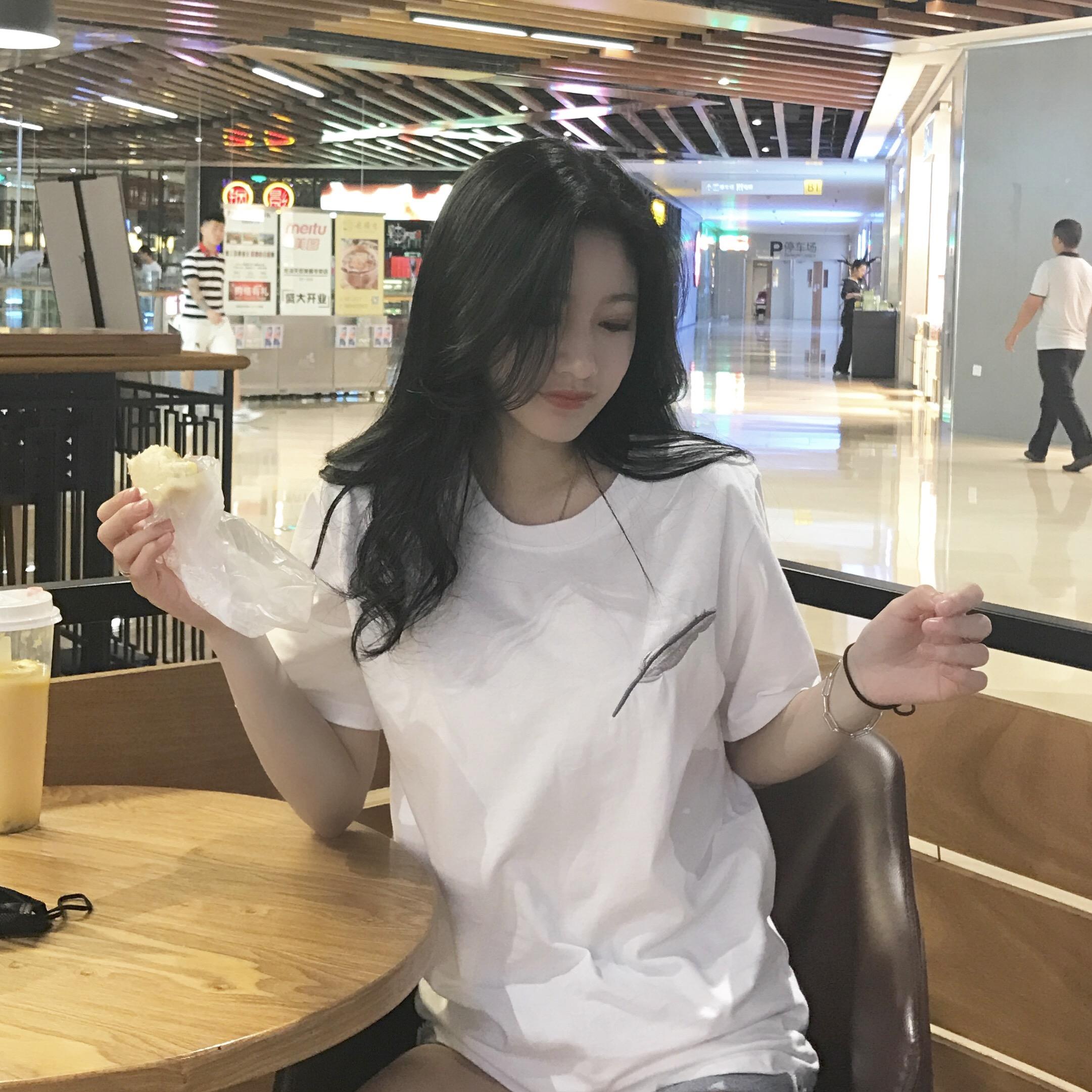 夏裝2018新款女羽毛刺繡百搭圓領顯瘦上衣氣質小寬松短袖套頭T恤