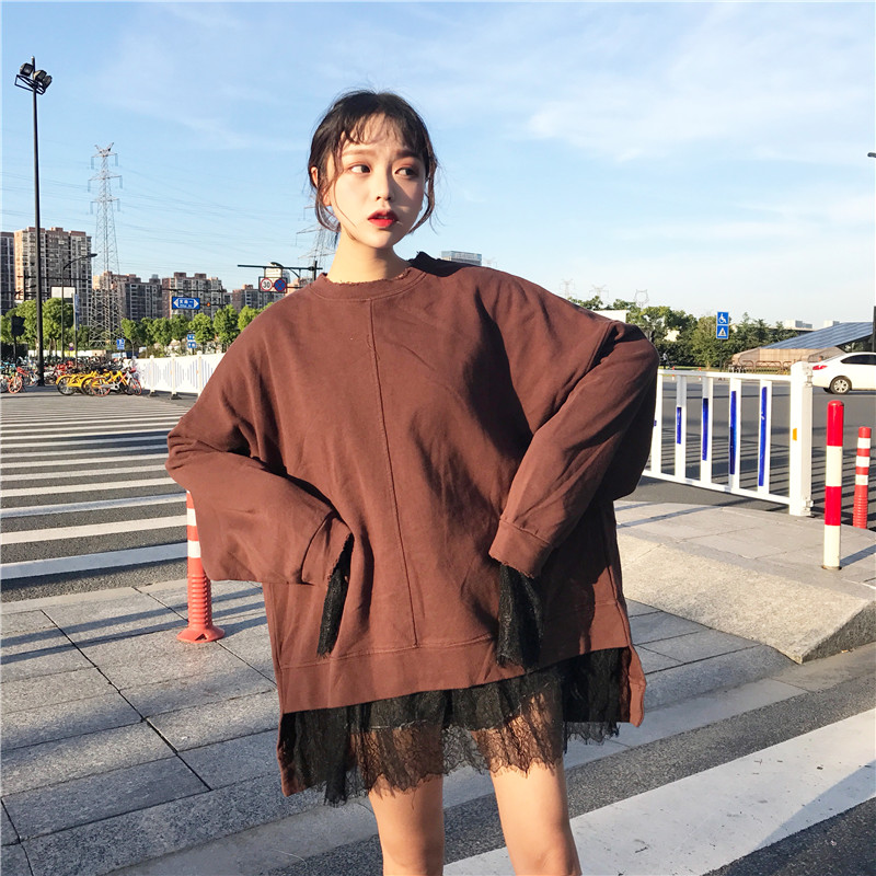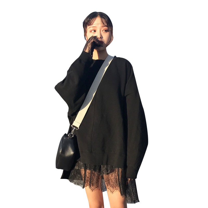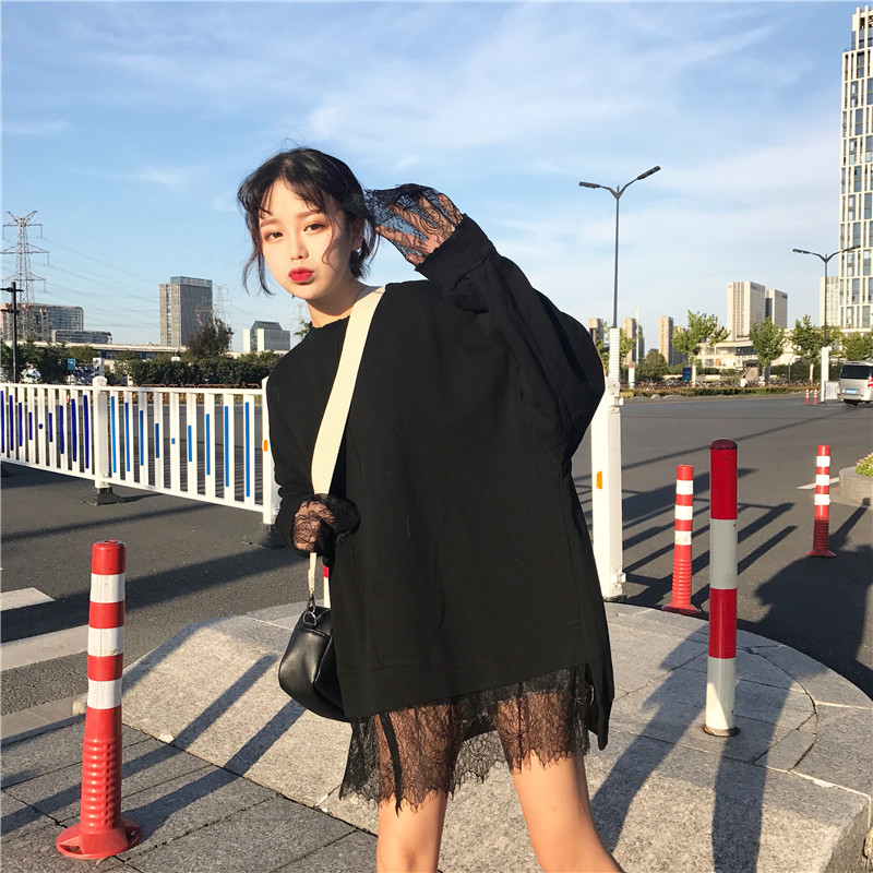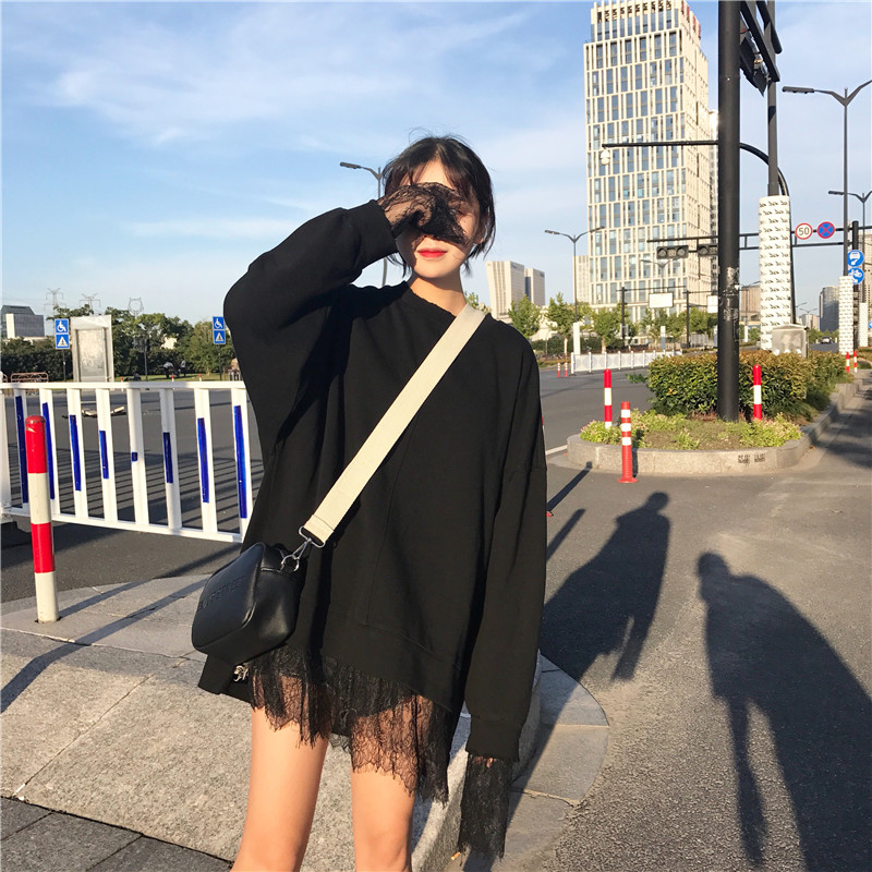 / 秋季韓版中長款蕾絲拼接假兩件套頭衛衣中長款寬松長袖上衣外套女