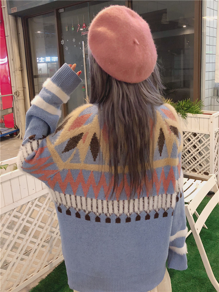 / 秋冬女裝韓版小清新菱形格紋寬松套頭長袖針織衫學生休閑毛衣上衣