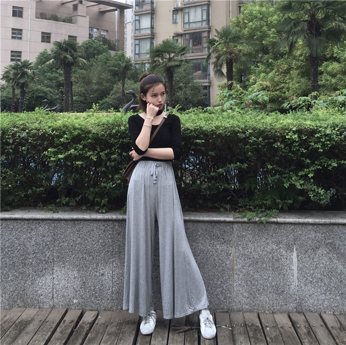 韓版女裝秋裝女2018新款簡約寬松顯瘦針織拖地直筒闊腿長褲休閑褲