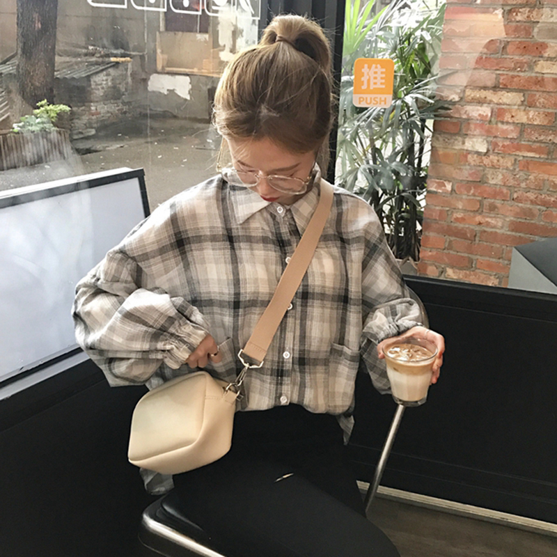 / 夏季女裝韓版中長款燈籠袖格子翻領長袖襯衣寬松休閑襯衫上衣外套