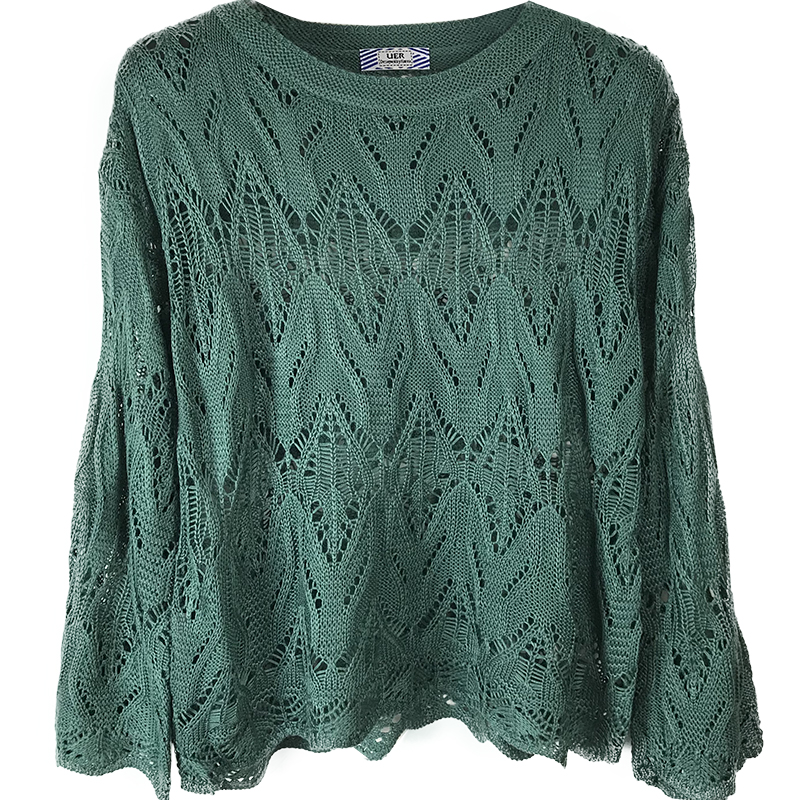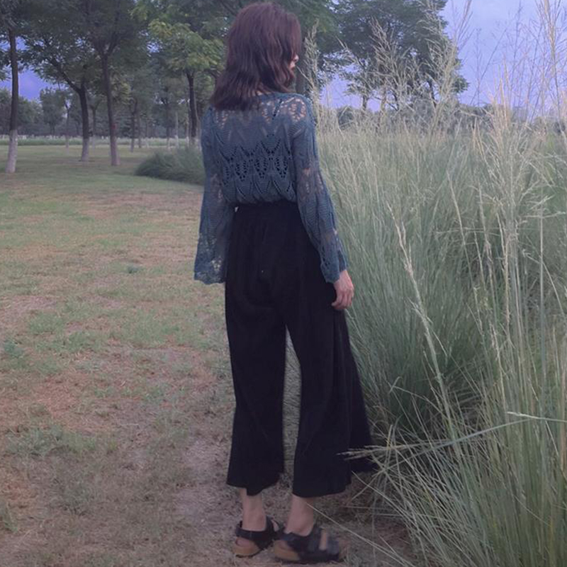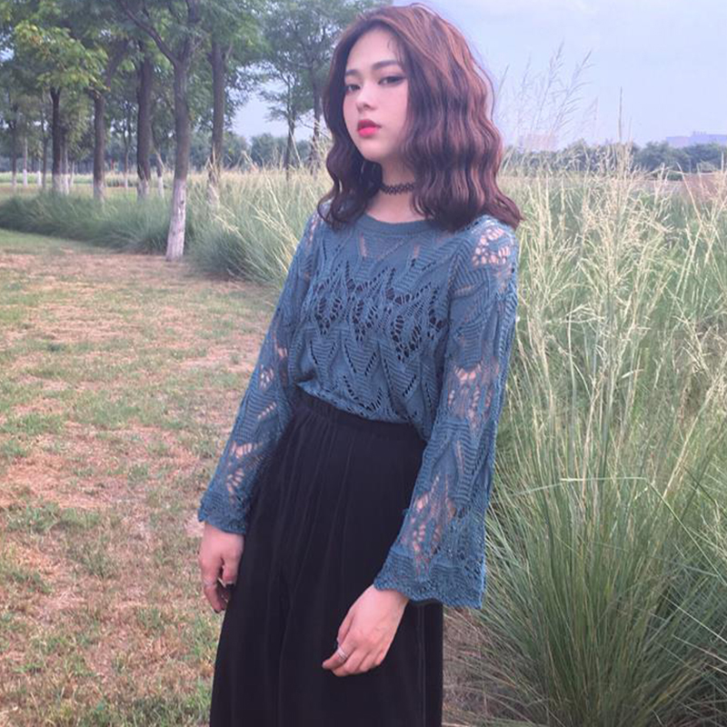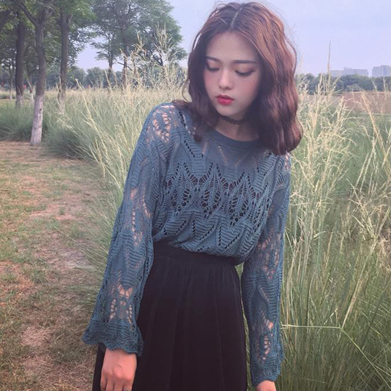 早秋chic港味上衣2018新款女裝鏤空女毛衣寬松喇叭袖透視針織罩衫