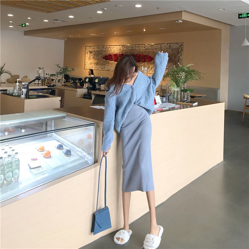 搭配的也是同色系的曲珠針織裙 中長款高腰設計 整整拉高了比例~