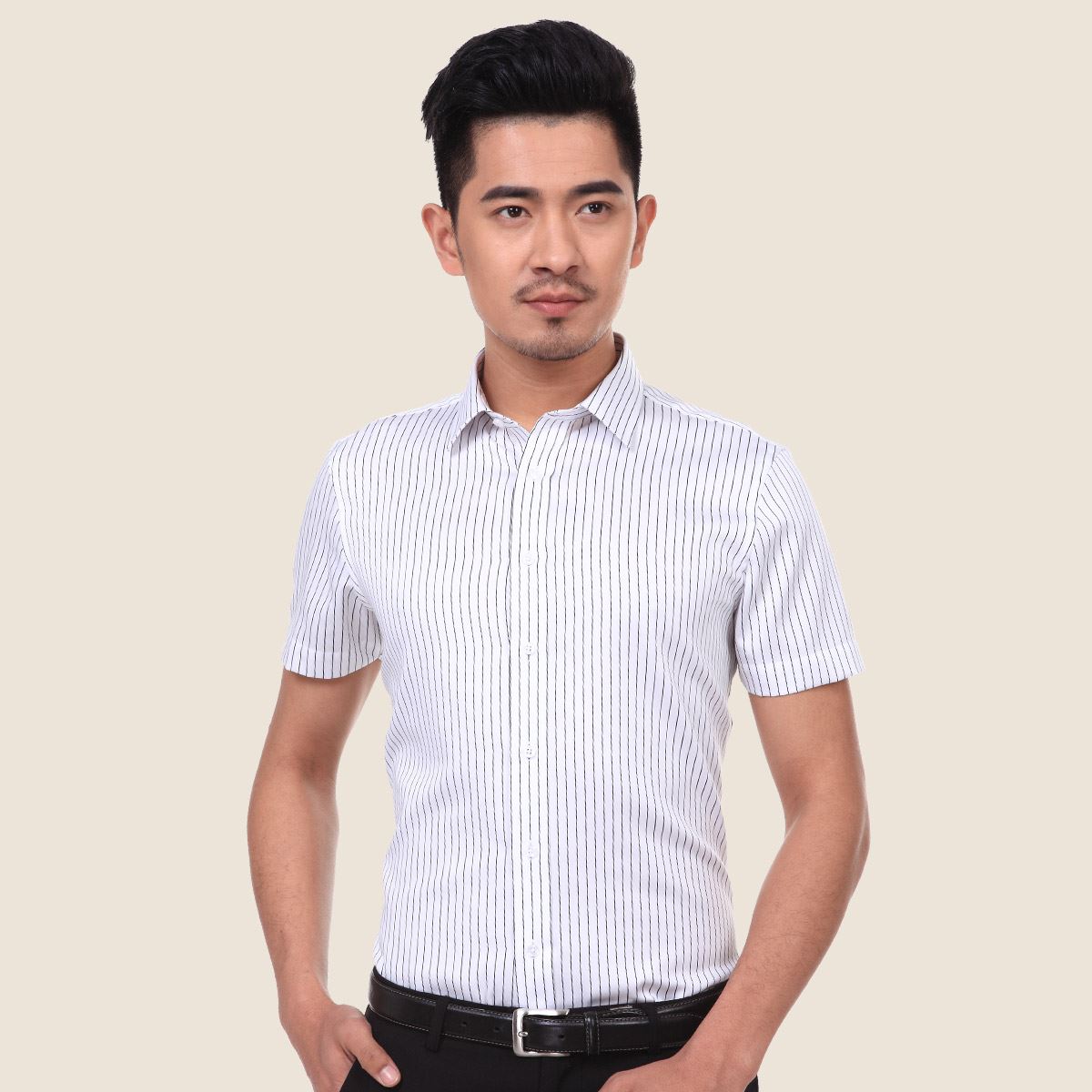 深海夏裝新款男士短袖襯衫男韓版修身絲光棉條紋黑白商務休閑