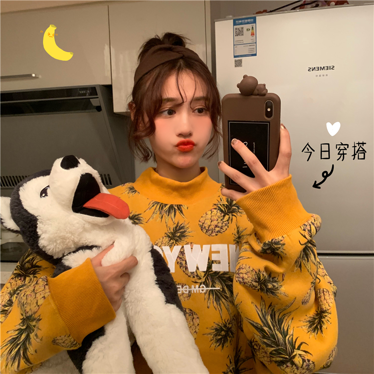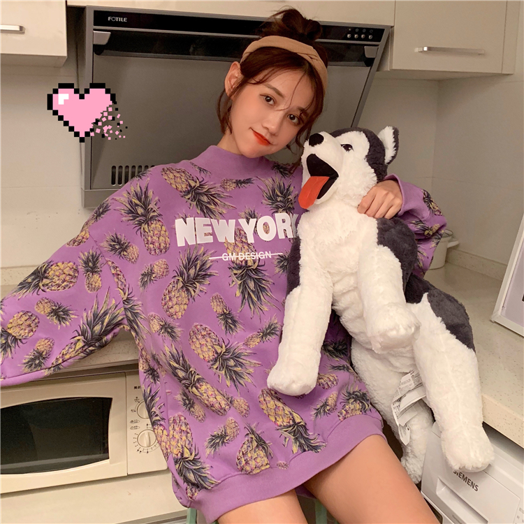 / 2018新款秋冬韓版中長款原宿風菠蘿字母小高領加絨加厚衛衣外套女