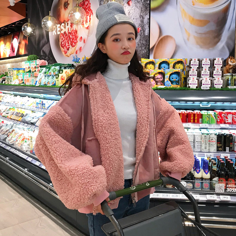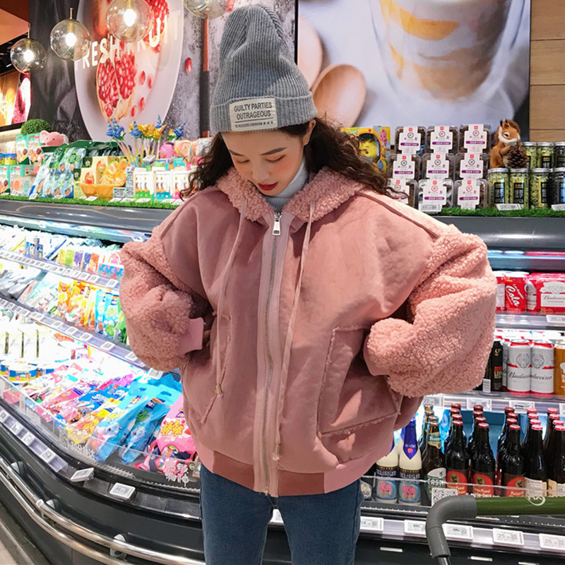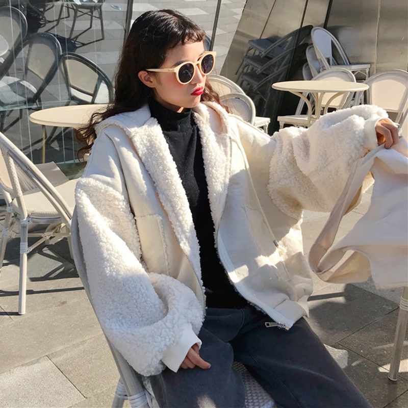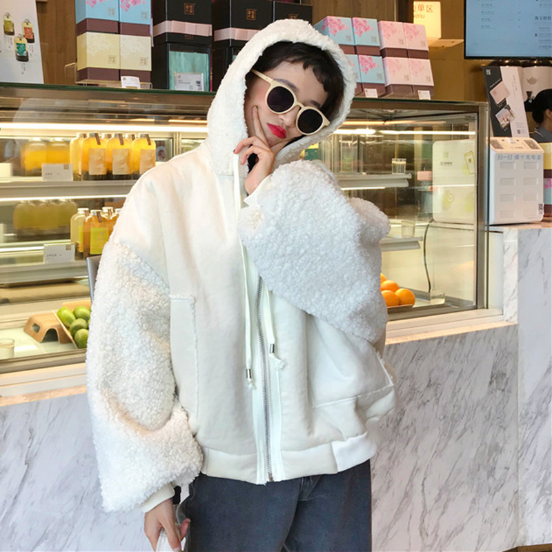 仿羊羔毛棉襖2018冬季女裝新款寬松連帽棉衣學生時尚白色長袖外套