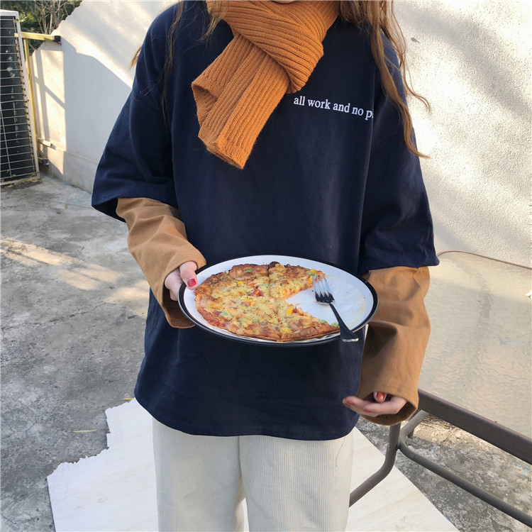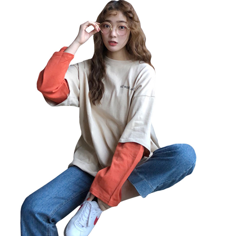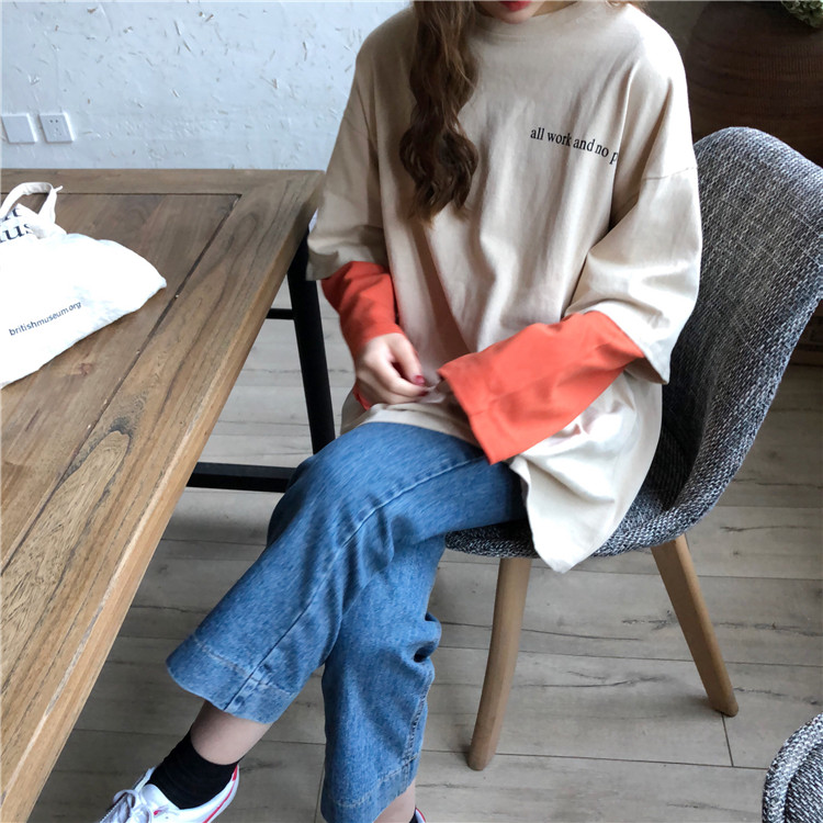 秋裝女裝韓版BF風寬松百搭假兩件拼色T恤中長款長袖休閑體恤上衣