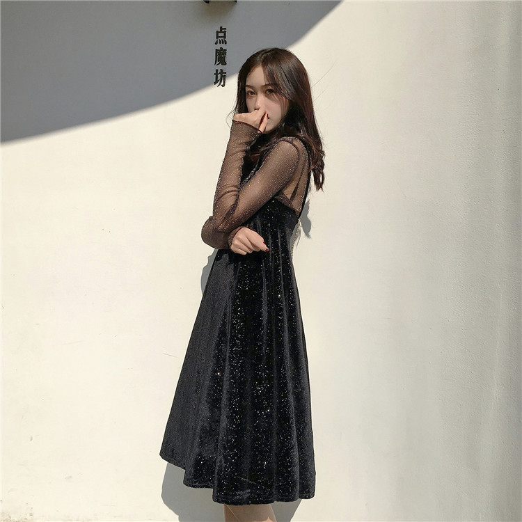 / 2018新款韓版氣質女人味深V領絲絨吊帶連衣裙網紗打底衫chic套裝