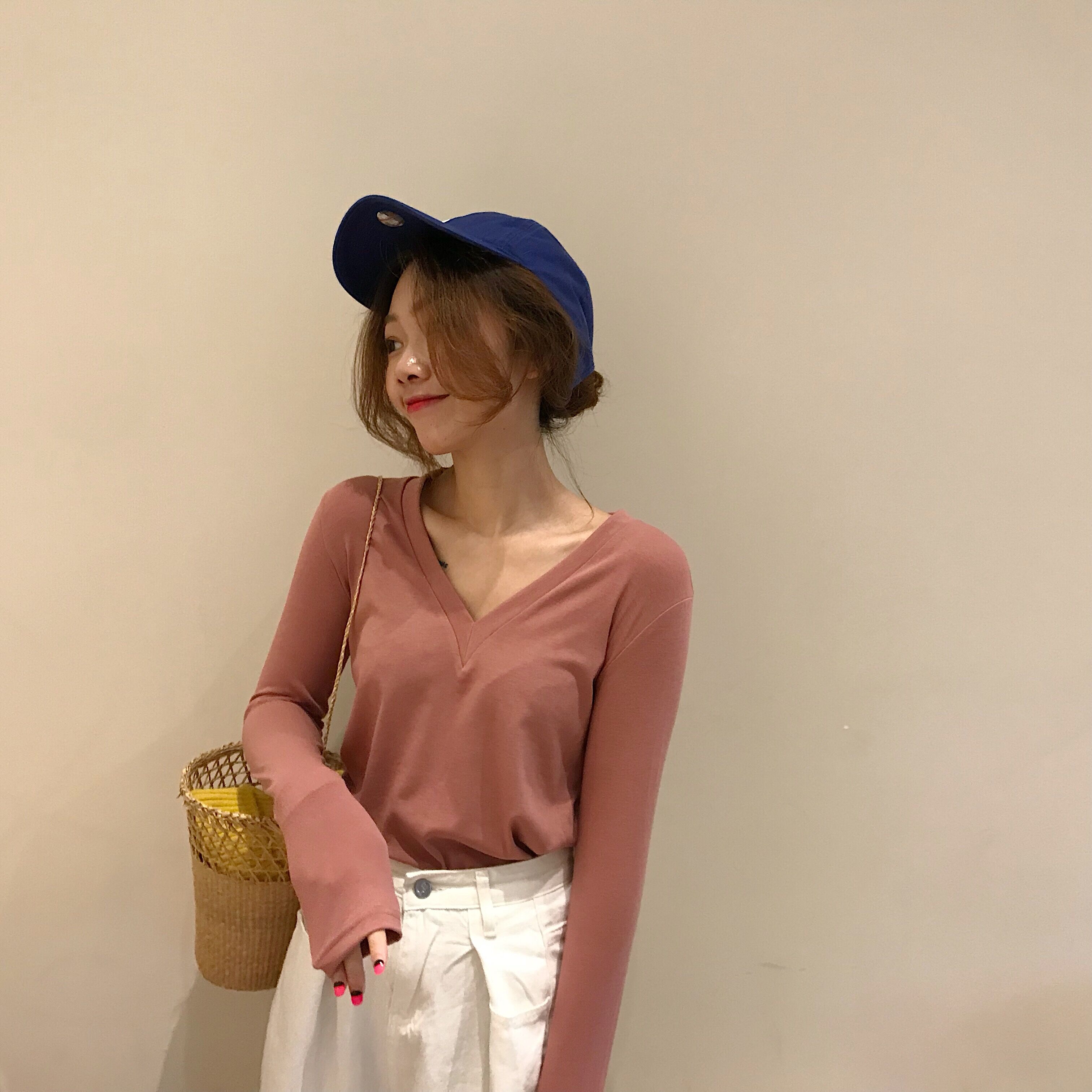 / 韓風早秋純色V領長袖修身chic上衣女T恤顯瘦簡約基礎百搭打底衫