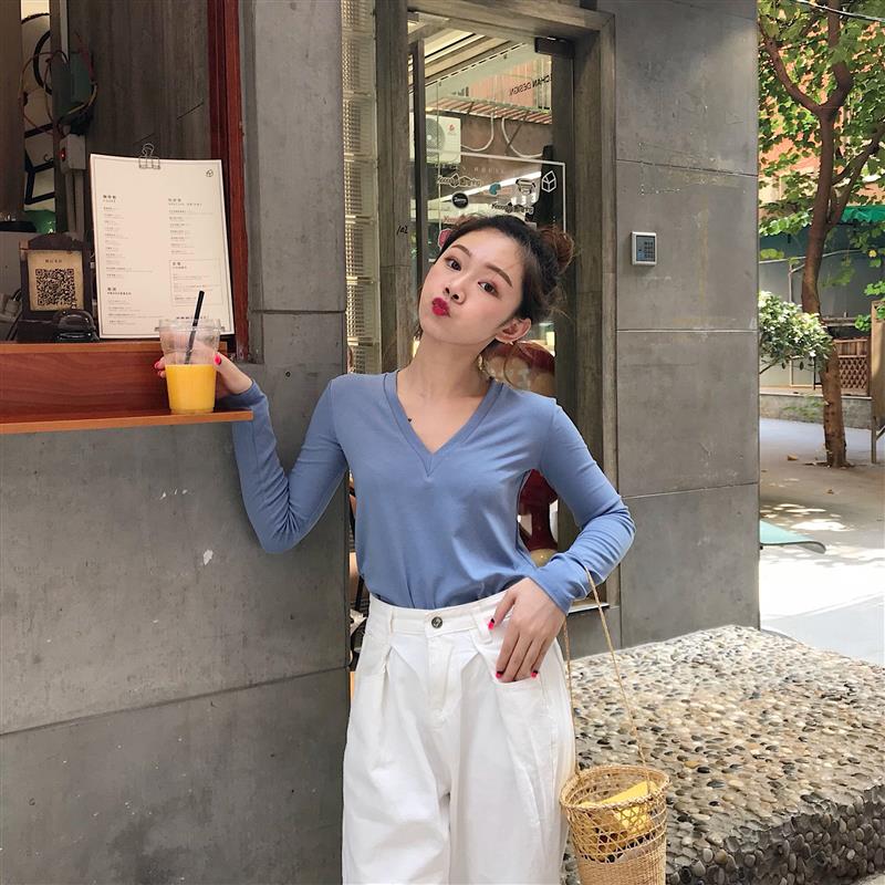 韓風早秋純色V領長袖修身chic上衣女T恤顯瘦簡約基礎百搭打底衫