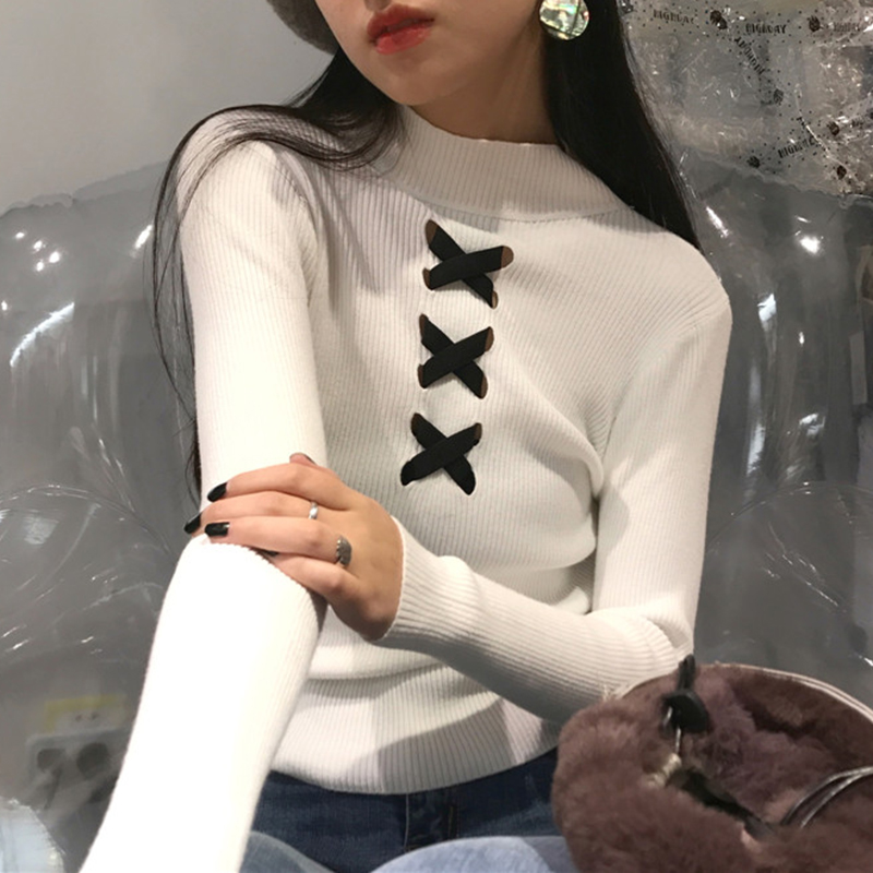 / 黑色半高領打底衫女秋冬 長袖 緊身上衣女針織衫修身交叉白色毛衣
