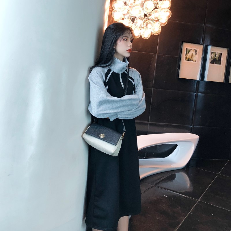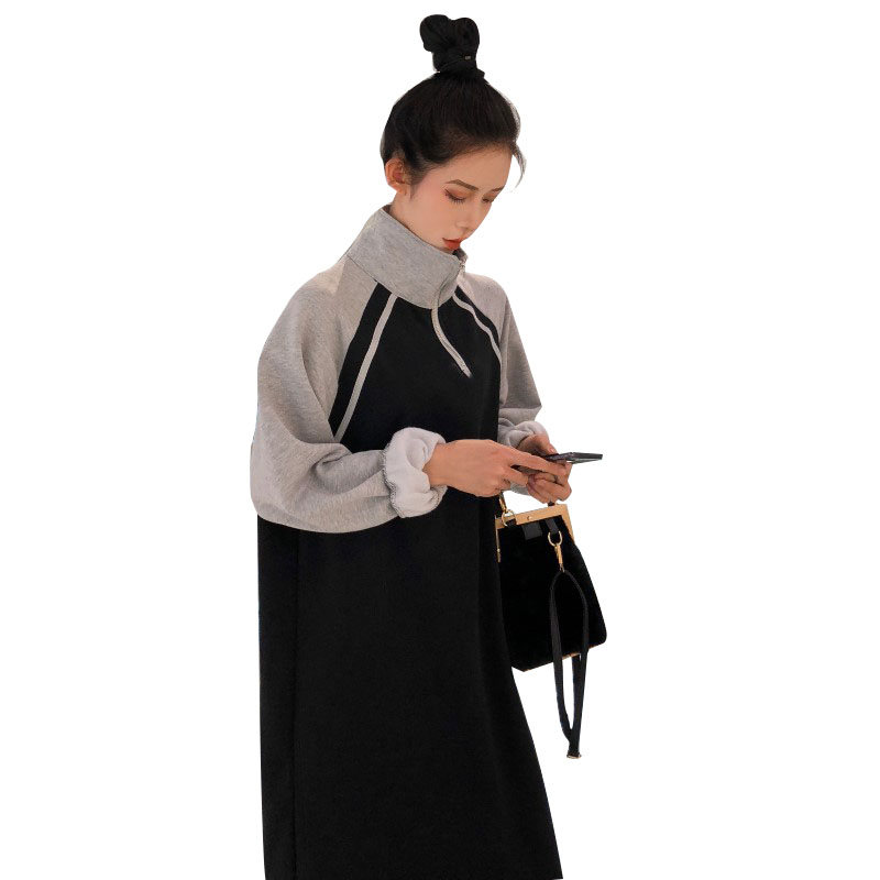 時尚慵懶風上衣女寬松衛衣女秋2018新款百搭拼色加絨中長款衛衣潮