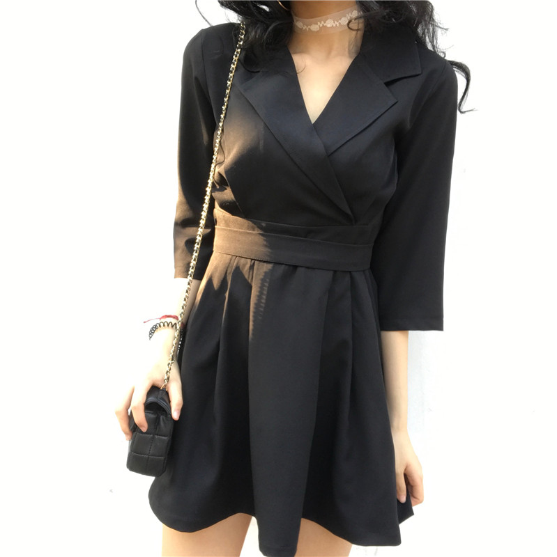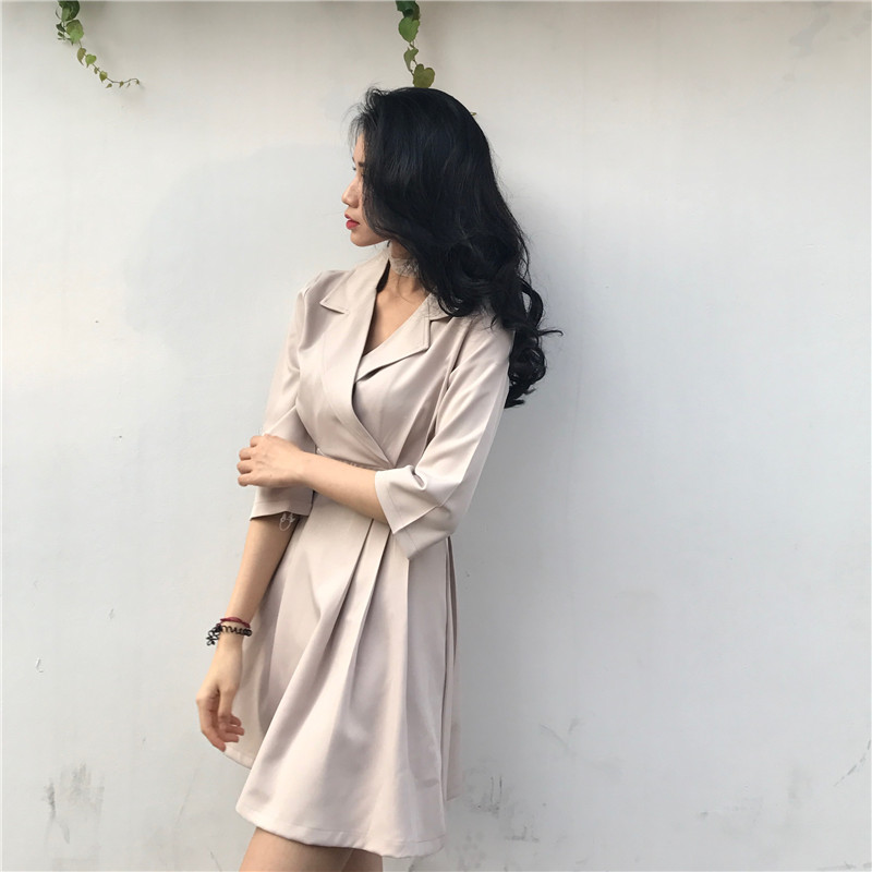 / 港味復古韓國chic風復古氣質V領高腰連衣裙百搭綁帶五分袖中長裙