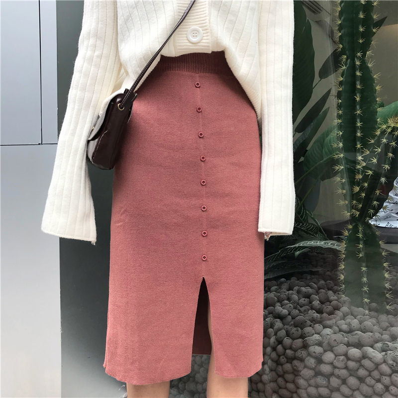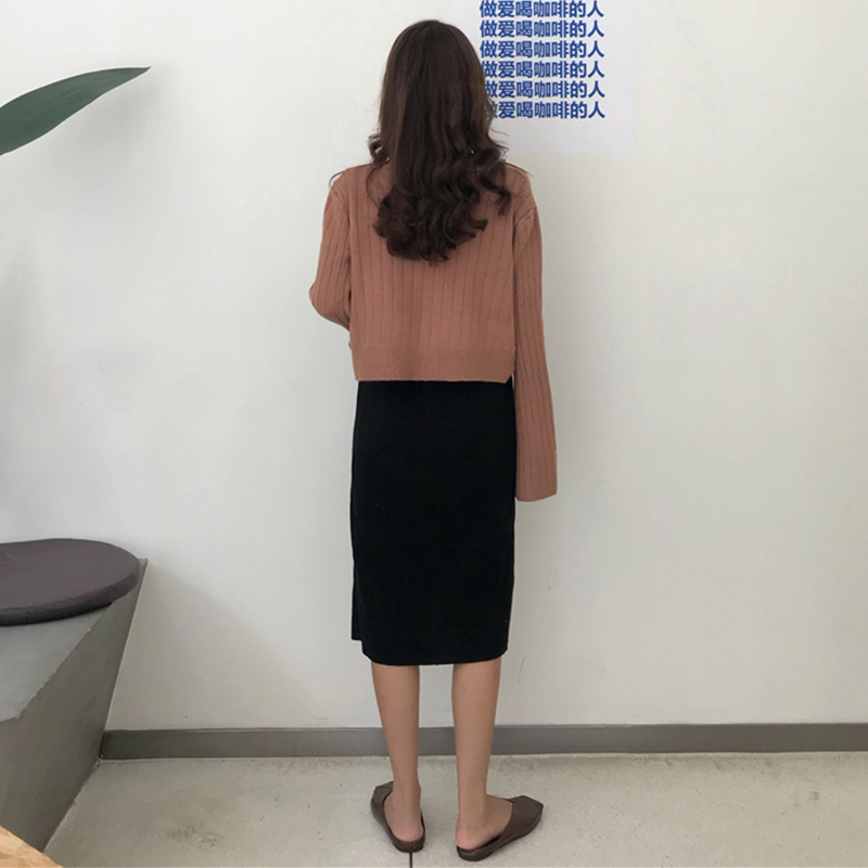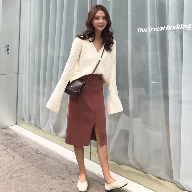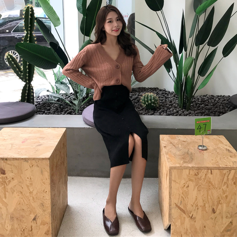 / 氣質套裝女秋新款時尚寬松V領針織開衫上衣+高腰黑色開叉半身裙子