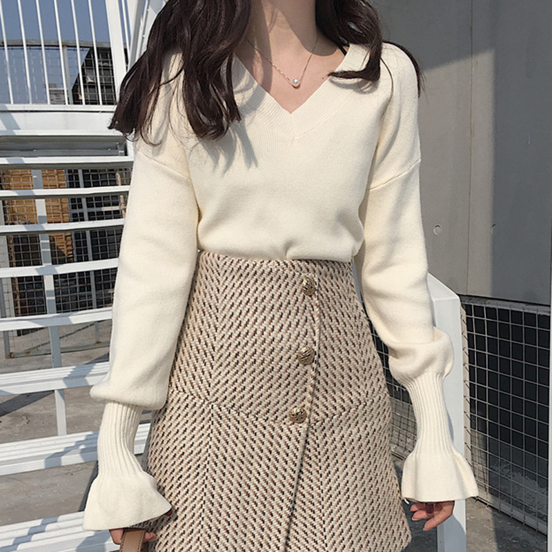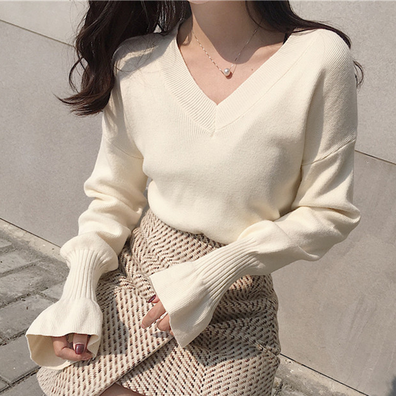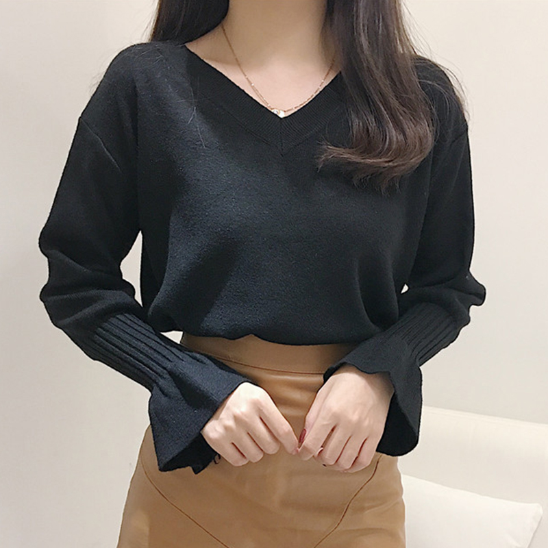 / 黑色修身打底針織衫女秋冬裝新款外穿套頭毛衣時尚V領長袖上衣服