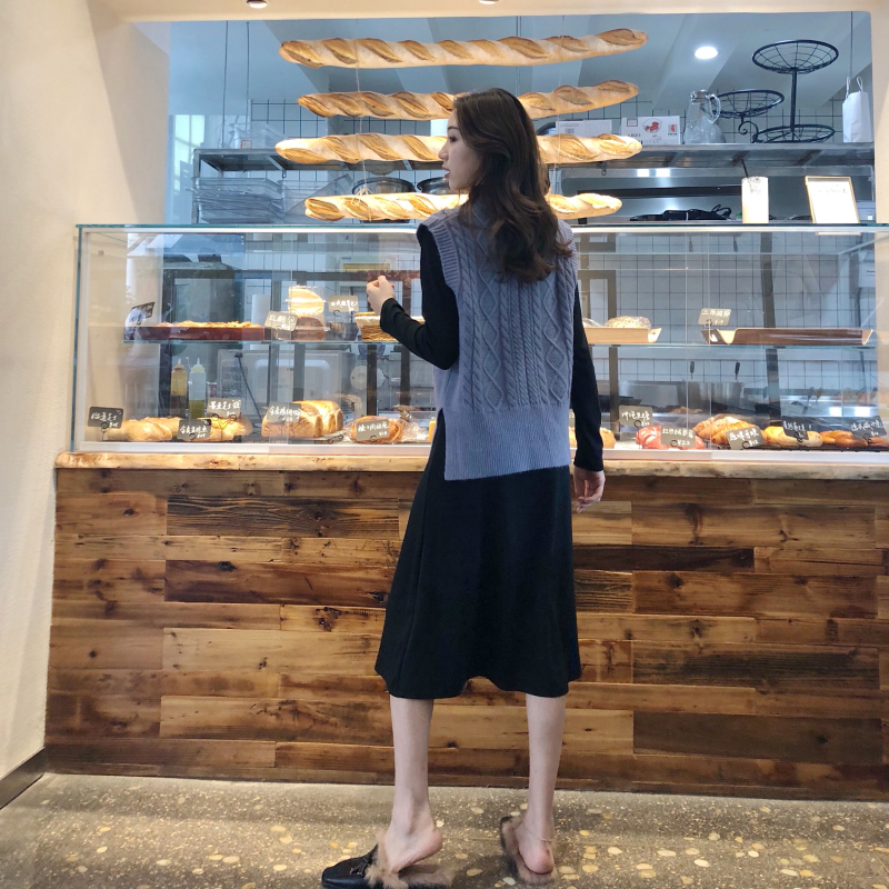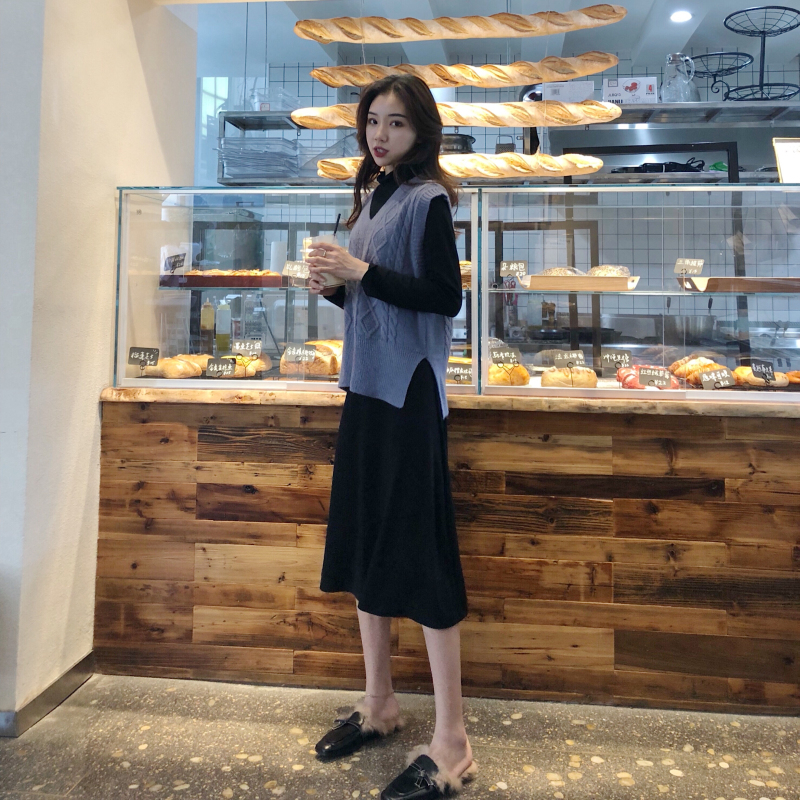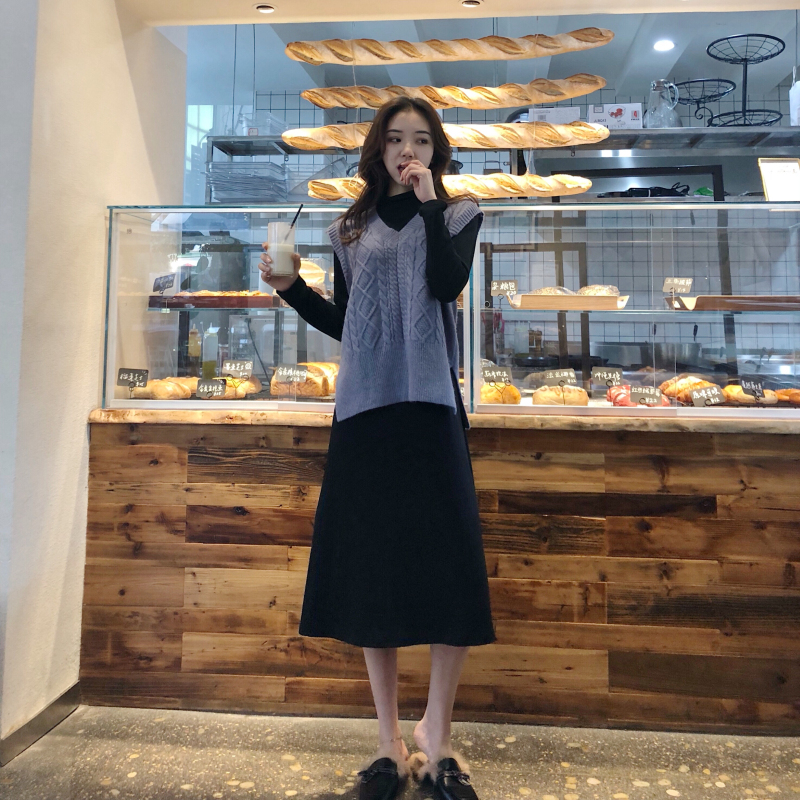 復古女神套裝秋冬新款百搭毛衣背心+針織高領打底+高腰一步針織裙
