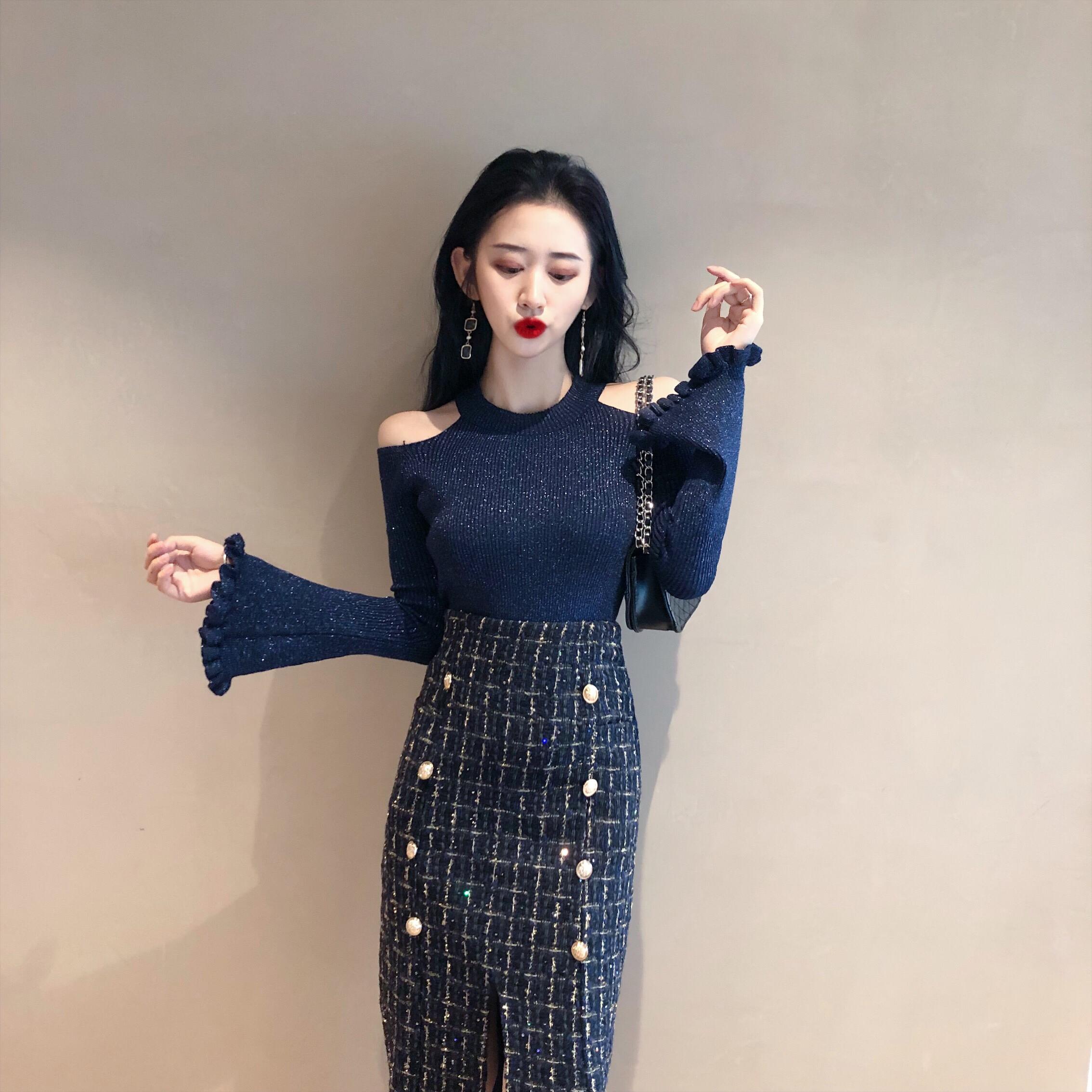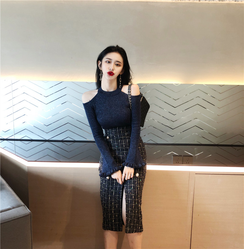 復古露肩心機喇叭袖小清新針織上衣+粗花呢子格子開叉排扣半身裙