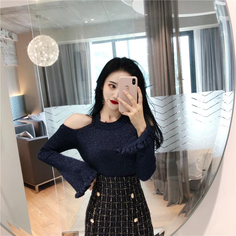 / 復古露肩心機喇叭袖小清新針織上衣+粗花呢子格子開叉排扣半身裙