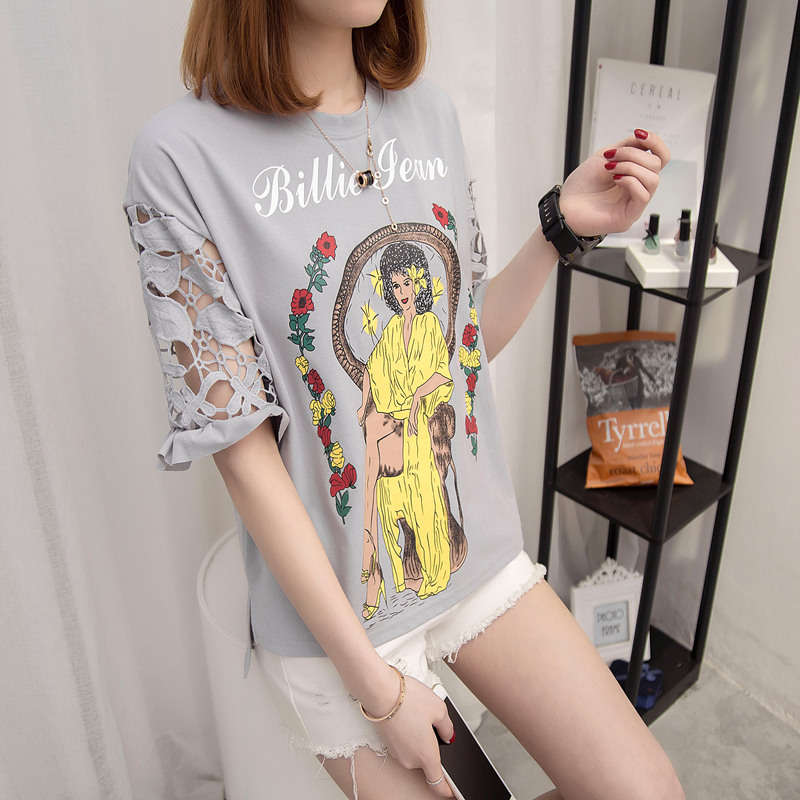 / 女裝春裝新款韓版潮白色蕾絲t恤女中長袖寬松百搭打底體恤衫